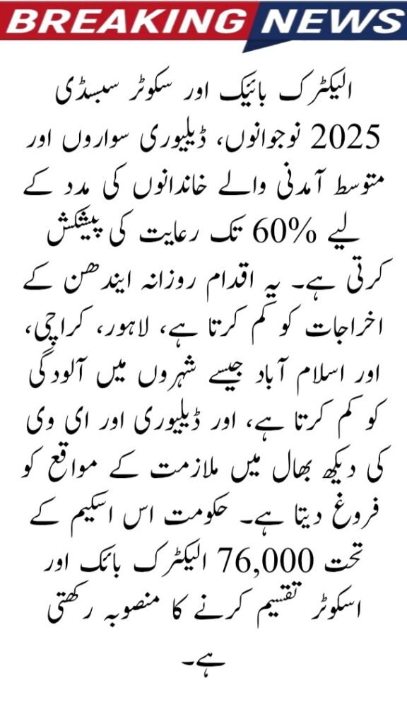 The Electric Bike and Scooter Subsidy 2025 offers up to a 60% discount to support young people, delivery riders, and middle-income families. This initiative reduces daily fuel costs, cuts pollution in cities like Lahore, Karachi, and Islamabad, and promotes job creation in delivery and EV maintenance. The government plans to distribute 76,000 electric bikes and scooters under this scheme.